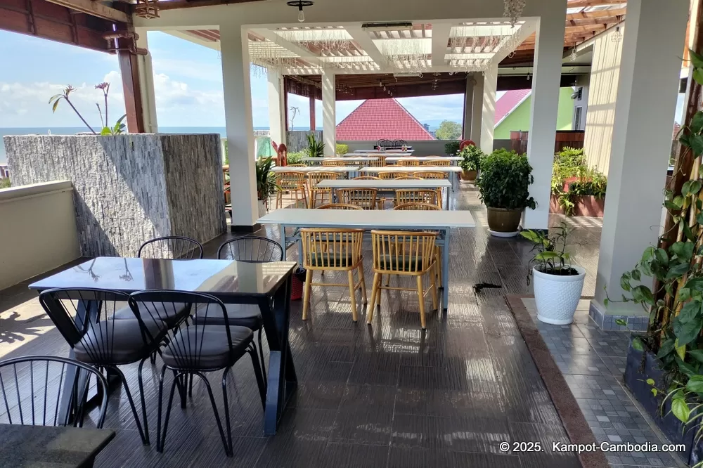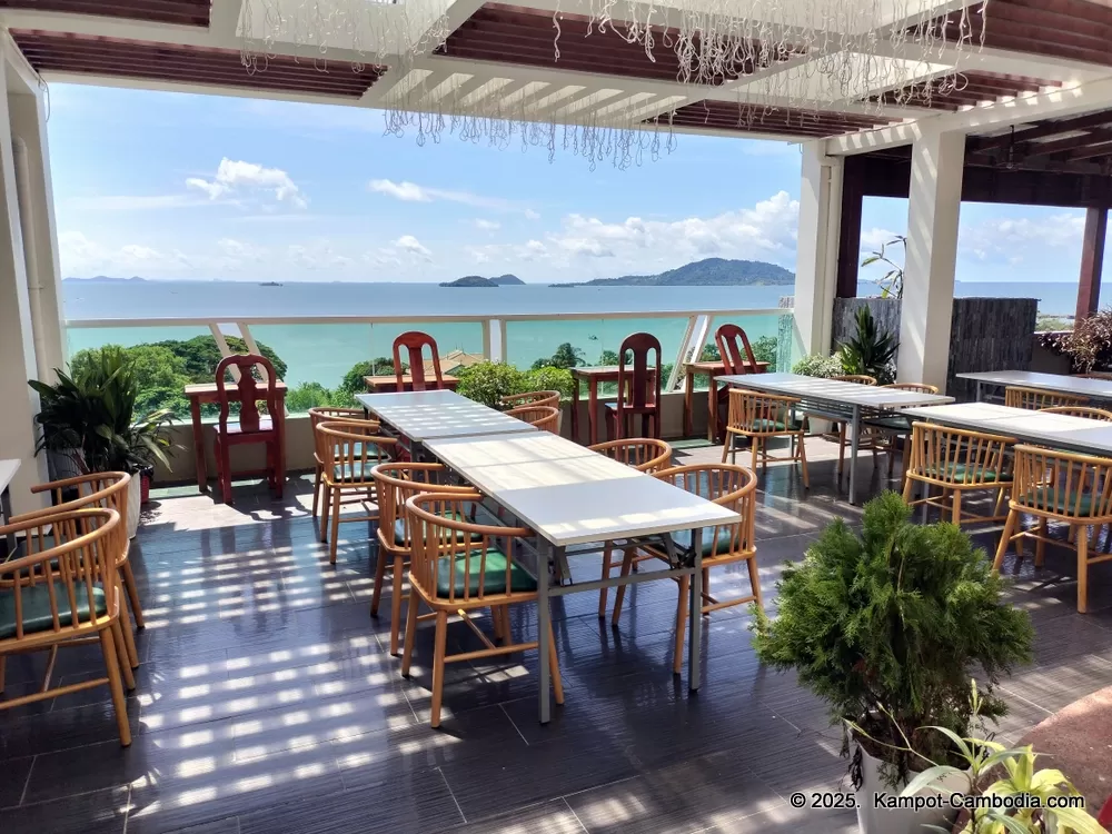 Sky bar and restaurant with great views of the ocean, island, and the Kep National Park in the back.